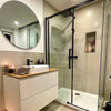 Die Alu-Profile in edlem Schwarz matt unterstreichen ein klares, modernes Design. Diesen Look können Sie gerne mit weiteren schwarzen Elementen in Ihrem Bad fortführen.